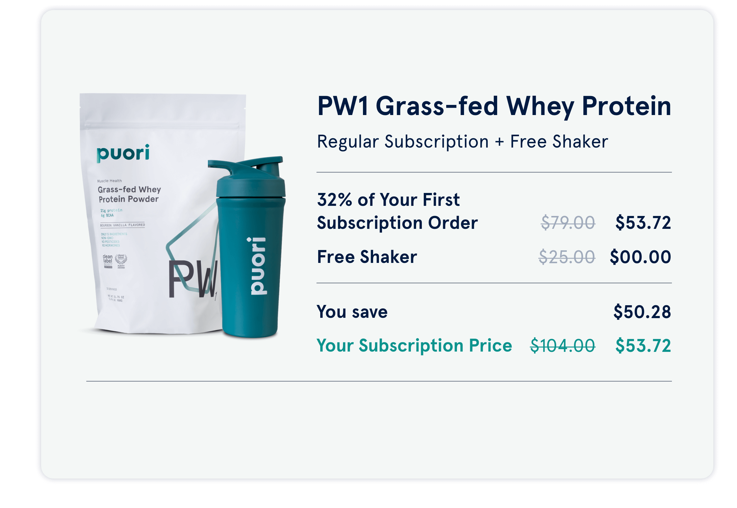 The free-shaker-offer is valid for customers placing their first PW1 Whey Protein subscription order only, while supplies last. It is limited to one free shaker bottle per customer. The offer is non-transferable and cannot be combined with other discounts. The cost of the shaker bottle will be automatically deducted at checkout and included with your first shipment. The shaker bottle is non-refundable but may be exchanged in the event of defects or faults. We reserve the right to modify or end this promotion at any time.