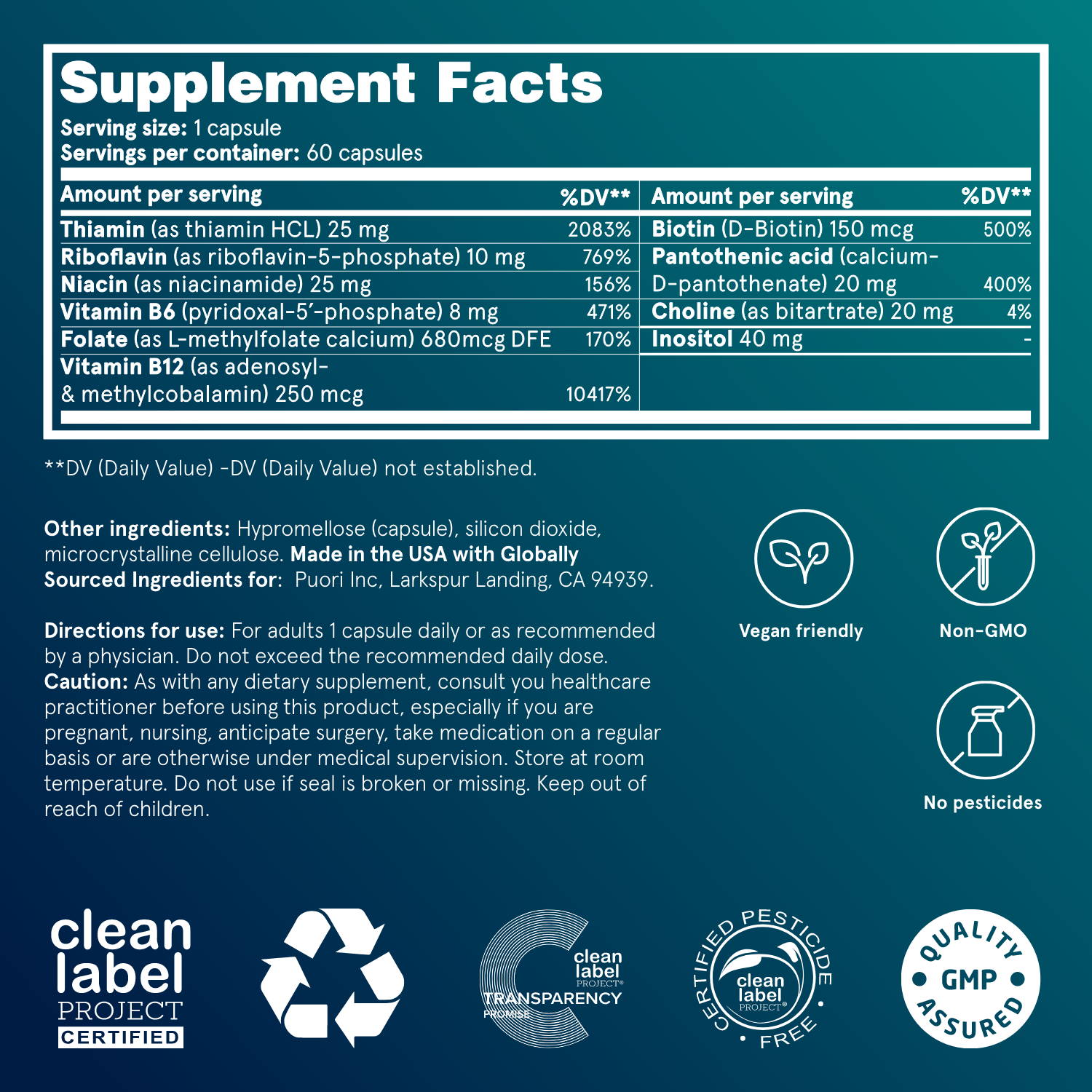 Every batch of Puori B-Complex is third-party tested and certified by The Clean Label Project® against 200+ contaminants. For your peace of mind.