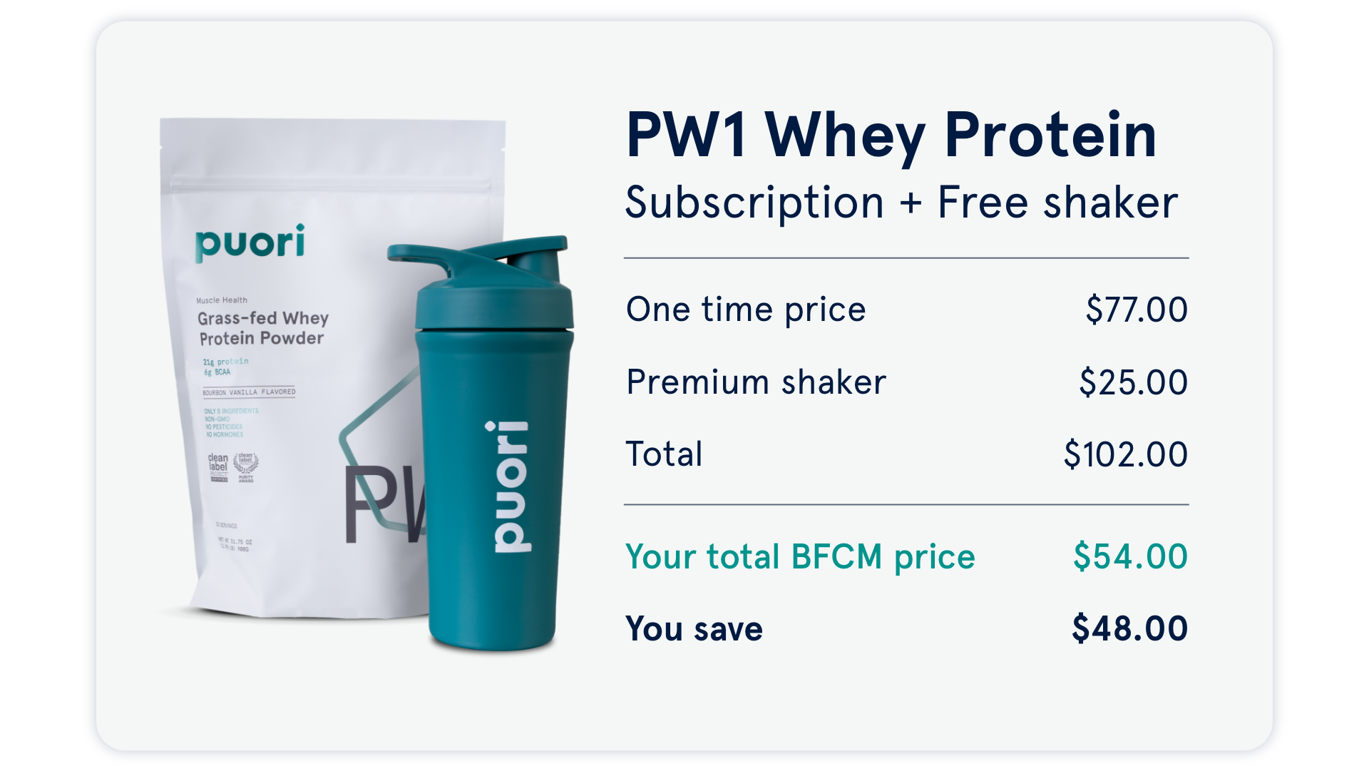 You save 30% when buying your first PW1 Whey Protein subscription order AND you get a free shaker worth $25.*